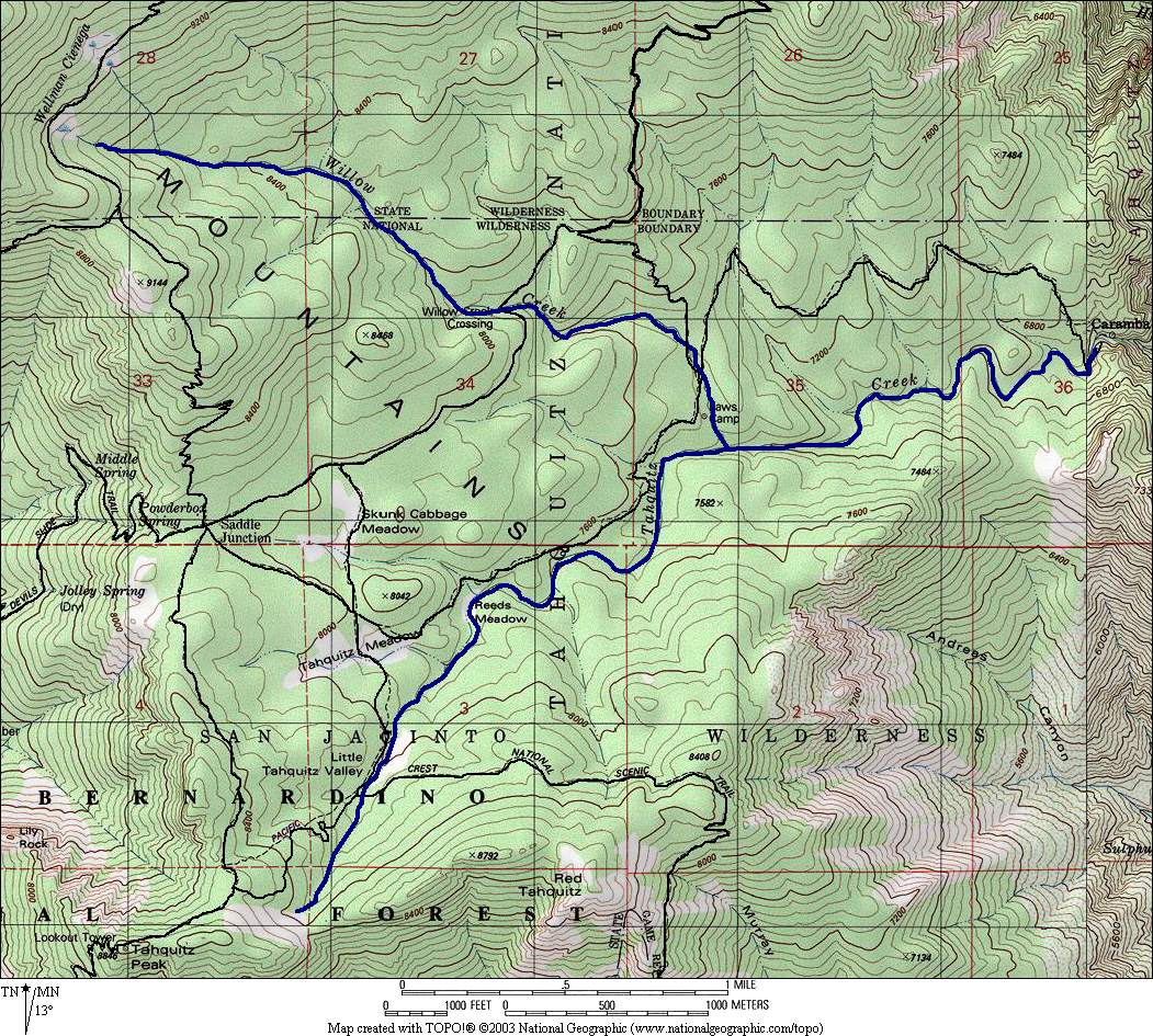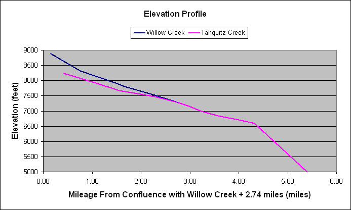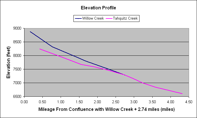 The zero of the mileage scale in the above plot was taken from the point where the Pacific Crest Trail crosses lower Wellman Cienega, and thus for Willow Creek, the x-axis label could simply read Mileage from Wellman Cienega. In order to place Tahquitz Creek on the same scale, it was measured upstream from its confluence with Willow Creek, which for Willow Creek is 2.74 miles from Wellman Cienega. This accounts for the clunky x-axis label in the above plot; otherwise we would have had to use negative mileages from this point or from Caramba.