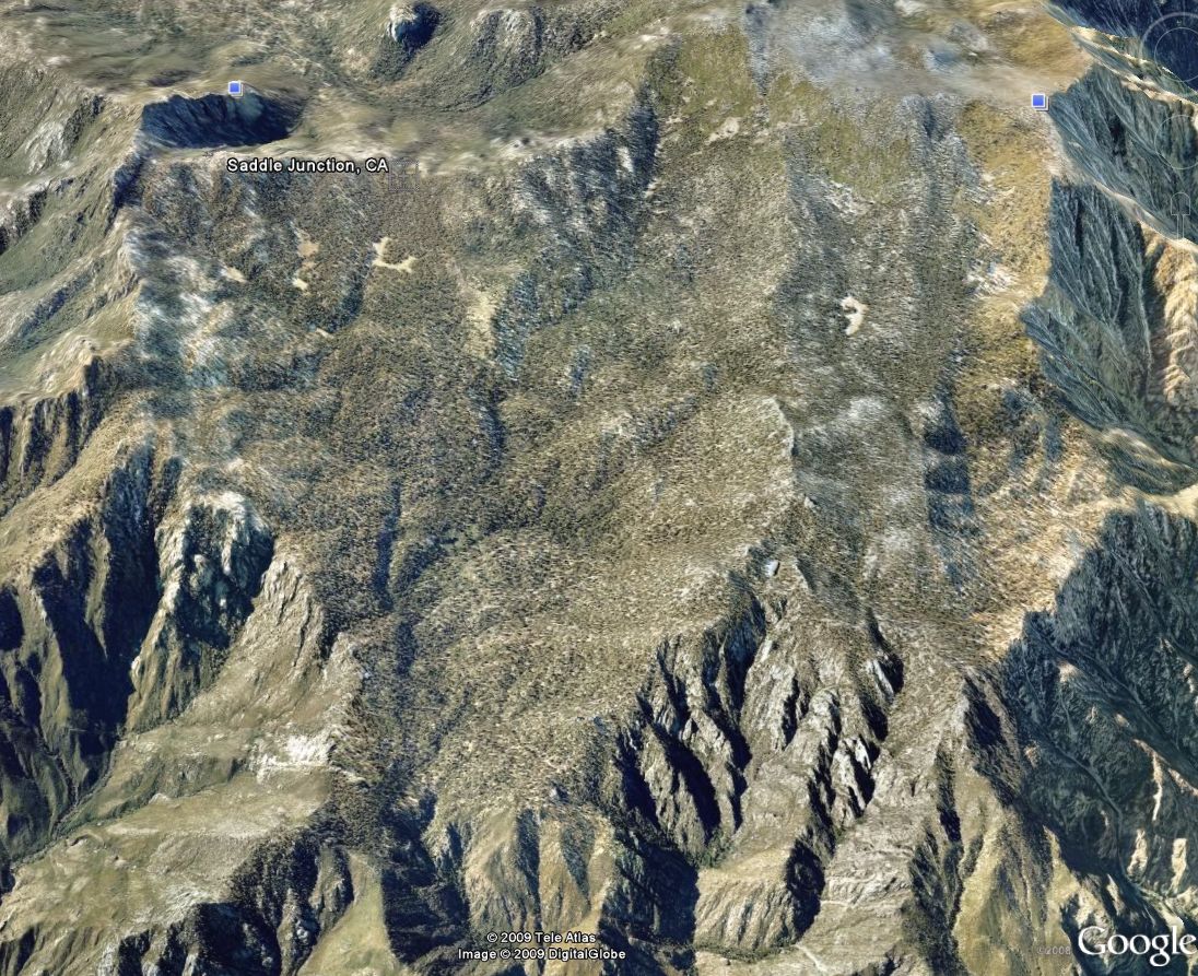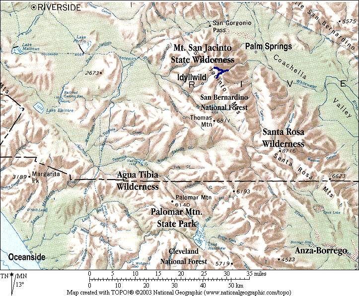 - the high north-south Tahquitz Peak / Marion Mountain Peak ridgeline to the west separating Tahquitz Valley from Strawberry Valley at Idyllwild (the yellow line is highway SR243 going through Idyllwild and Pine Cove);