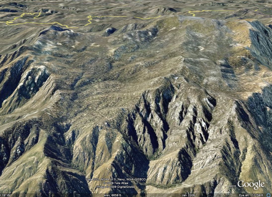 In the Google Earth image below, looking up canyon, to the west, with north on the right, it is delineated by: