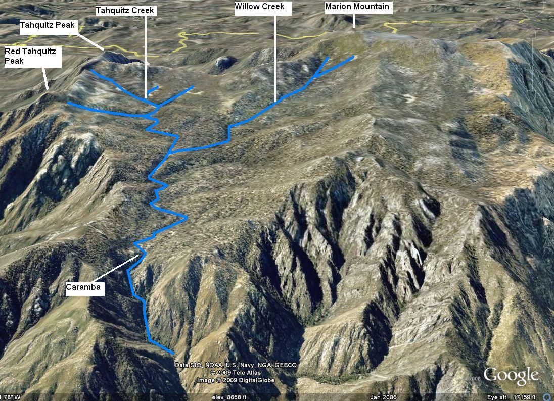 Lower Tahquitz Creek, from the confluence with Willow Creek to the lip of the escarpment at Caramba Camp, flows east-west overall, but with significant but small north-south meanderings. The canyon walls mostly follow the east-west trend. This section has a more gentle elevation gradient overall, but still has bouldery sections interspersed with flattish sections.