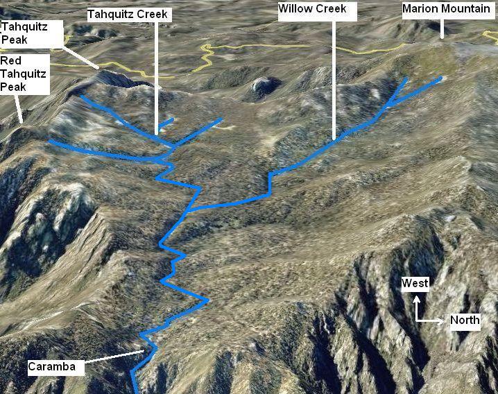 See also a map showing a larger area with labels; a map showing a larger area without labels; and a map from a perspective looking more straight down on Tahquitz Valley without labels. All these linked maps have the same orientation, with north to the right, and show the neighboring Tamarack / Round / Long Valleys to the north.