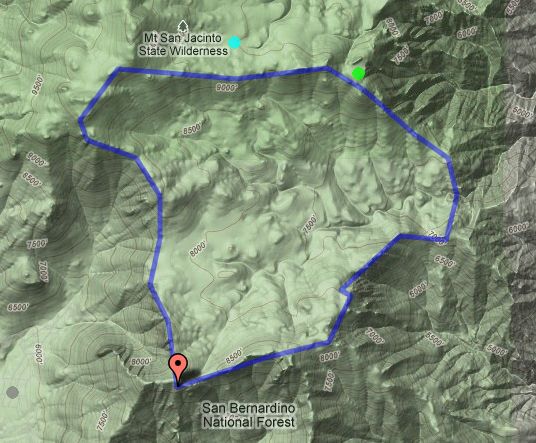 - The east-west Tahquitz Peak / Red Tahquitz Peak, and northeast Red Tahquitz Peak / Caramba ridgeline to the south separating Tahquitz Valley from Garner Valley; and