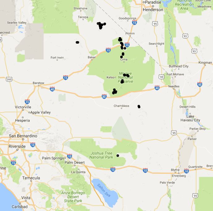 Fig. 4. Locations of the 159 plants of Tetradymia comosa found by Bruce Watts in eight days of targeted surveys and from a few subsequent surveys. See Fig. 3 for the location of this area on a map.
