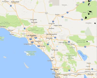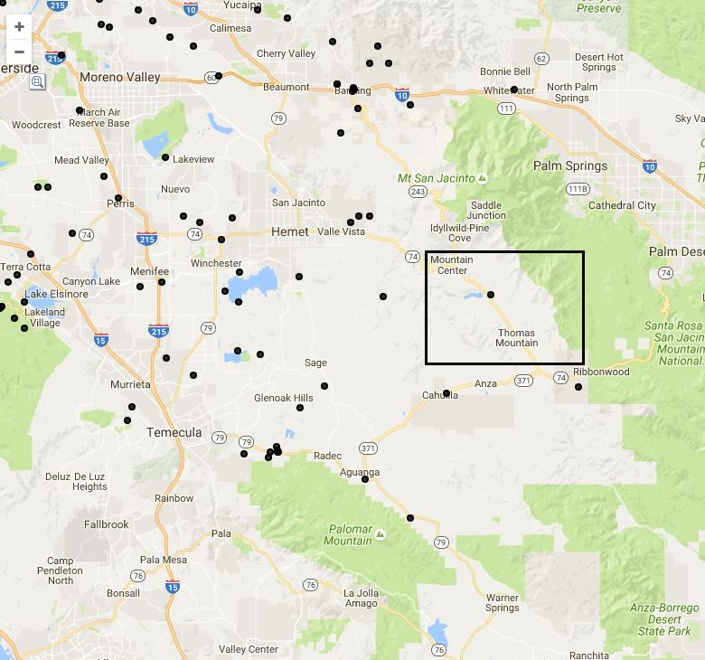 Fig. 3. The geographic locations of vouchers of T. comosa for the San Jacinto Mountain area. The rectangle shows the area displayed in Fig. 4.Fig. 4 shows a Google Earth view of the locations of the 159 plants found by Bruce. See Fig. 3 for the location of the area displayed in Fig. 4 on a map.