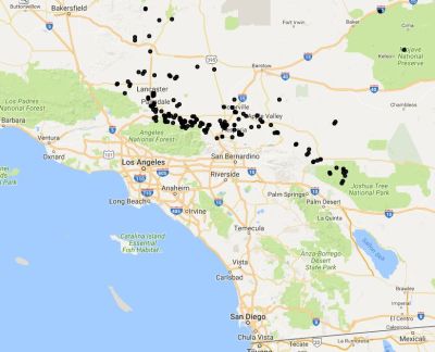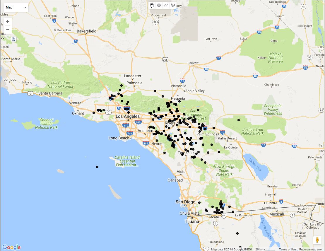 Fig. 6. A map of vouchers of T. comosa taken before 1980, showing areas where there have been no or few vouchers collected after 1986, possibly because T. comosa has been extirpated in those areas by urban development. This map does not show the population found in southeast San Diego County.Voucher data provided by the participants of the Consortium of California Herbaria (ucjeps.berkeley.edu/consortium/).