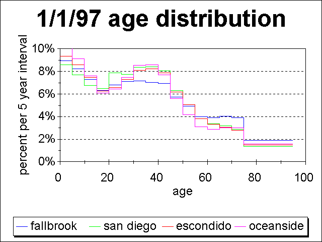 To a first approximation, the demographic curves for each population sample look similar, and resemble the overall demographics of the entire U.S.. (The easiest way to do this comparison is to put the Fallbrook plot in one browser window, the U.S. plot in another browser window, and alt-tab between them.)