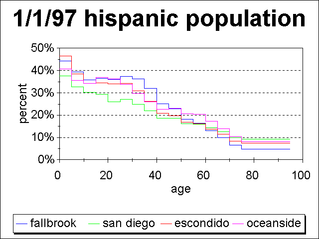 The age distribution of the greater Fallbrook area (Subregional Area 55), which includes De Luz, Rainbow and Bonsall, as of 1/1/97 is shown on the left below, with the Hispanic percentage shown on the right. Also plotted for comparison are the cities of Escondido and Oceanside and the entire county of San Diego.