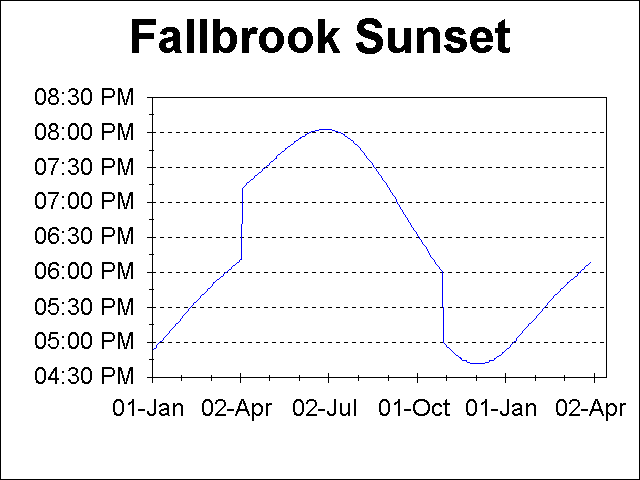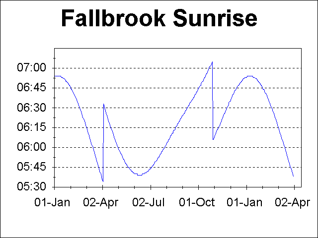 The following plots show the sunrise, local noon and sunset times for Fallbrook, CA, using daylight time when applicable, which accounts for the 1 hour jumps in the times near the beginning of April and the end of October. The data were obtained from the US Naval Observatory specifically for the location of Fallbrook (W117o 21', N33o 23') from USNO Sunrise/Sunset Computation.