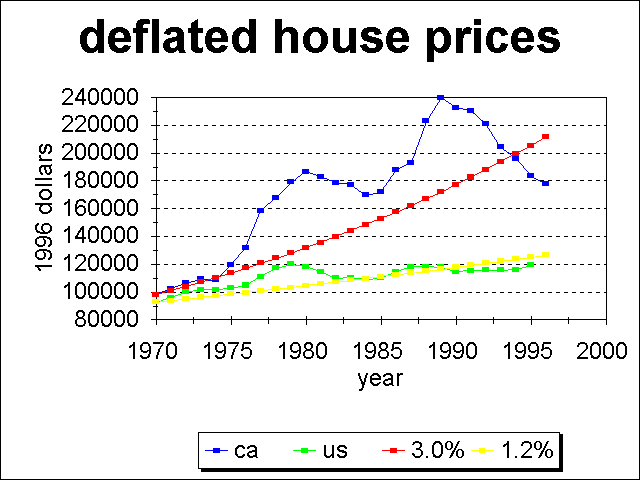 The median home prices of California and U.S. homes in both inflated and deflated dollars is shown in the following two graphs. The left-hand graph below shows the median home price in constant 1996 dollars, along with two curves for comparison: a constant rate of increase of 3.0% to compare the California values against, and a constant rate of increase of 1.2% for the U.S. values.