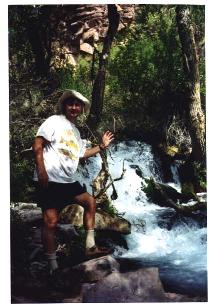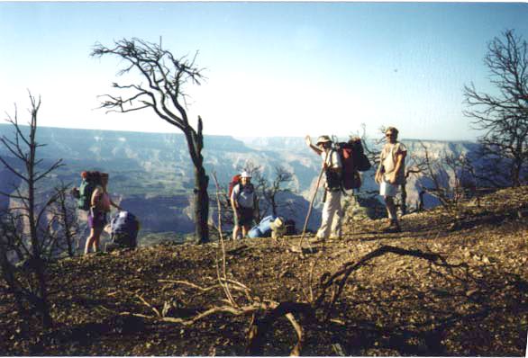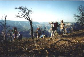 The group now consisted of Gene, Linda, Tim, Cynthia, Tad and myself. Tom, Craig, Rich and Eric, who had stayed overnight at the North Rim Lodge, would start later and meet us at Deer Creek camp ground. The trail from the parking lot entered through a cattle gate and started to climb about 300 feet to Monument Point at 7200 ft elevation. Climbing through forest-fire-blackened brush on a footpath still covered with ashes, we reached the unmarked trailhead in 30 minutes. A retired Forest Service ranger in Fredonia told me later that in June 1996 a lightning-caused fire started at Monument Point. The Park Service let the fire burn out of control. It then proceeded into the Kaibab National Forest and burned almost 50,000 acres before it was put out.