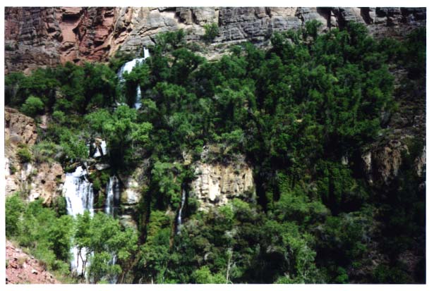 At 3:00 pm we reached a saddle point between Surprise valley and the Thunder river canyon. The green outline of the Tapeats River was visible in the distance, about 2000 ft below us. The Thunder River spring should now be "just around the corner". We started the steep descent into the south east facing canyon with increased optimism. The canyon walls would soon cast their shadows on the trail. We huddled behind the first shady rock at 3:30 pm, in sight of the roaring Thunder spring, and reached the short side trail to the Thunder river spring at 3:45 pm, at about 3400 ft elevation. The physiological contrast between the Hawaii-like hanging garden of the Thunder spring, with its natural air-conditioned coolness after marching through the hot desert, is enormous, and is matched by the psychological impact. In the Bible the Jewish people are reported to have wandered through the desert for forty days without water. (In this temperature they would have lasted two days, maybe.) Small wonder that they were impressed when Moses hit a rock wall and a huge river burst in the open. We were in no hurry to leave the Thunder River spring. I took my shoes off to cool my feet in the water, while, upstream, Tim and Tad were filtering water into the empty water bottles.