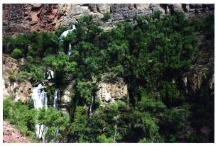 The Thunder River area, said to be U.S. Senator Barry Goldwater's favorite place in Arizona, is truly impressive. Water rushes from two, approximately foot-wide and several feet tall, almost rectangular openings from an underground river in the Muav Limestone, which cave explorers have supposedly followed 3000 ft deep into the mountain. Access to the caves was not obvious and I was not tempted to take a chance on further exploration. The water volume produced by the spring does not fluctuate with the seasons. Based on the percolation time of water through sandstone and the depth of the spring, the age of the water coming out of the spring could be hundreds of years. What looks like moss from the distance are big clumps of mint growing along water waterfall. A profusion of climbing pentstemons, popularly known as scarlet honeysuckle and common to the coastal areas of Southern California, with bright red half inch long flowers, climbed up the waterfall. Sitting about hundred feet from the spring, my camera could capture only a fraction of the scene. The waterfall had an almost hypnotic effect on me and I sat there absorbing the roaring sound, the mist and the faint smell of peppermint and honeysuckle for hours, until it was time to say good-bye.